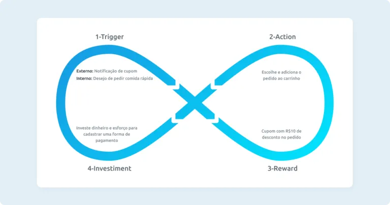 Gatilhos Externos: Comunicam ao usuário qual a próxima ação que ele deve realizar, eles podem vir através de um CTA, notificação, anúncios e outras formas. Por exemplo: “Horário de almoço, aqui está um cupom para pedir sua próxima refeição” (Te lembra algum app?).