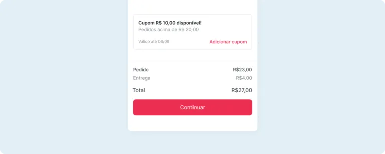 Na última etapa você adicionou seu almoço ao carrinho, portanto aqui está sua recompensa, um cupom de 10 reais e entrega grátis. Essa fase é crucial para garantir o investimento do usuário e consequentemente levá-lo a repetir o ciclo outras vezes. Aqui, o incerto prende nossa atenção, isso nos leva a buscar cada vez mais por outras recompensas.